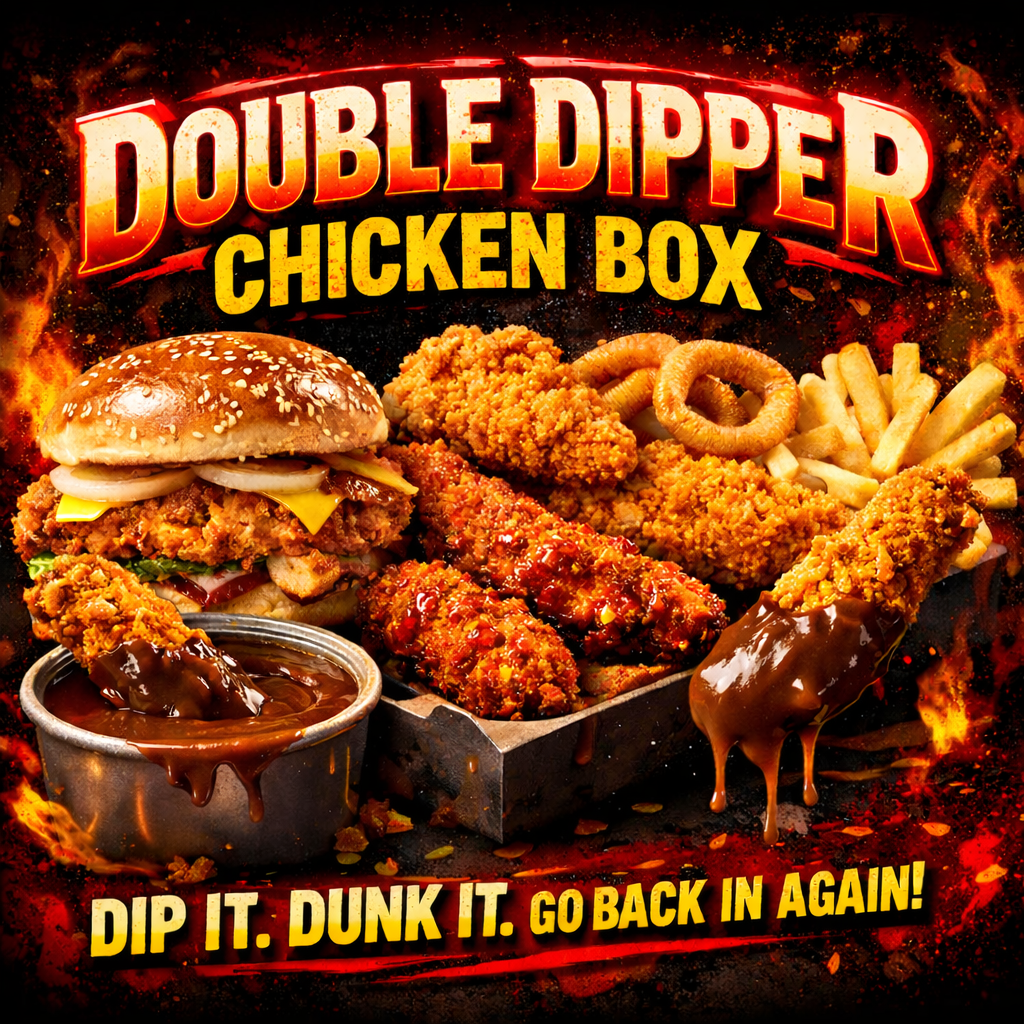 One box. Zero restraint. The Double Dipper Chicken Box is stacked for serious chicken lovers — a crispy chicken burger…