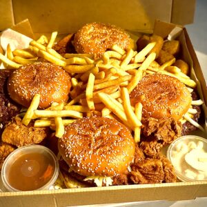 Rated 5 out of 5Two Double Smash Burgers, Two Chicken Burgers, Large Fries, Jalapeño Cheese Bites & Chicken Chunks all topped With Mozzarella Cheese,…