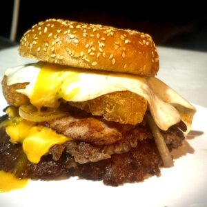 Rated 5 out of 5A seeded bun filled with a 4oz Steak Pattie, Fried Chicken, Pulled Pork, 3 Onion Rings, Cheese and a selection…